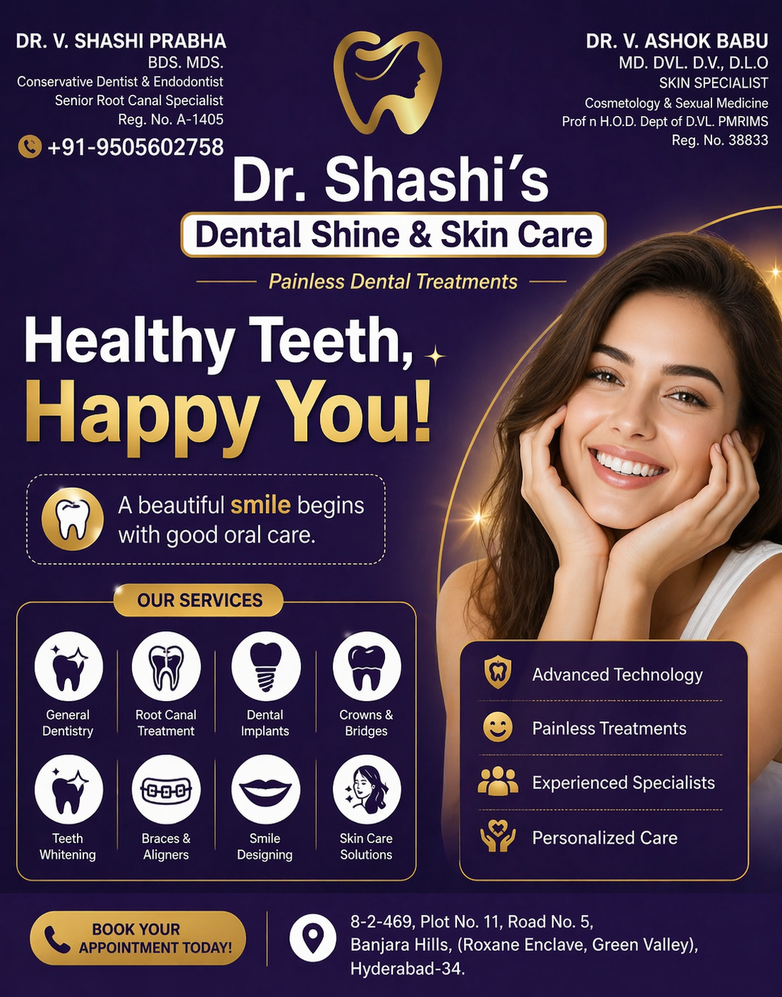 ✨ Introducing Advanced Painless Dental Care in Banjara Hills! At Dr. Shashi’s Dental Shine & Skin Care, we are now focused on delivering painless dental treatments in Hyderabad with advanced technology and personalized care. If you are searching for a best dentist in Banjara Hills, root canal specialist near me, or dental clinic for teeth whitening and dental implants, our clinic offers complete solutions under one roof. From root canal treatment, dental implants, crowns & bridges, smile designing, and teeth whitening to expert skin care treatments, we ensure comfortable, stress-free procedures with high-quality results. Led by Dr. Shashi Prabha, we are committed to giving you a healthy, confident smile with gentle and modern dentistry. 📍 Banjara Hills, Road No. 5 📞 9505602758 👉 Book your appointment today and experience the difference in painless dentistry!